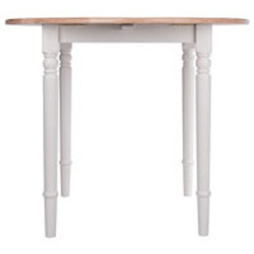 The graceful detailing of the turned legs and the full aprons all in white provide a solid base for the Natural round tabletop with its two drop leaves. Fold the leaves down and use the table as a console or in a breakfast nook for two. With the leaves open, the table offers ample seating for four for dinner or a special Sunday brunch. The farmhouse styling will brighten your kitchen, dining room or family room.