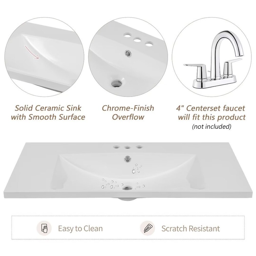 Ceramic Sink - The elegant white ceramic sink with rounded basin is equipped with an integrated overflow and three hole faucet mount. Half-moon shaped design ceramic sink extends boundary almost to the edge to make a large sink. Ceramic is so easy to clean that you can keep it smooth and shinning effortlessly. 4 "" centerset faucet will fit this sink (not included).