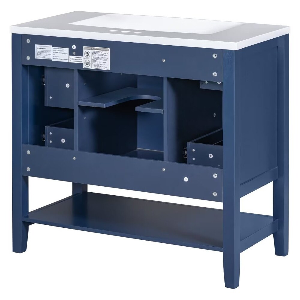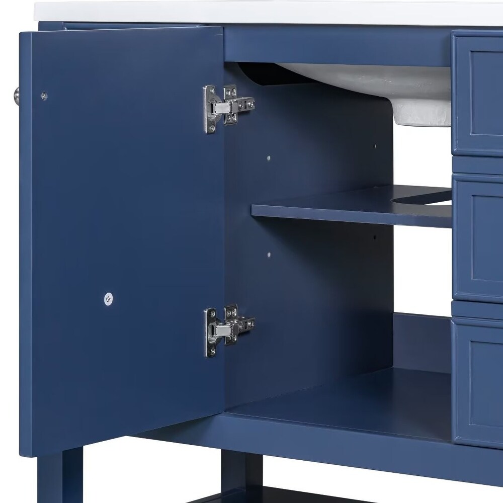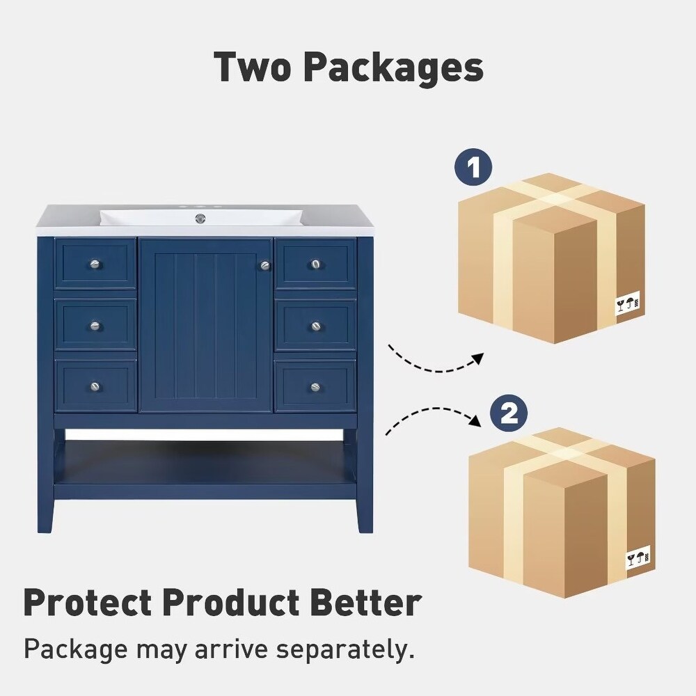 Vanity with Cabinet & Drawers & Shelf - Considering the humid environment in bathroom, this bathroom vanity has ample enclosed storage spaces: one cabinet with door, one functional drawer on the left and two drawers on the right with slide rails, and lower open shelf. You can put soaps, towels, shampoos, tissue paper and other bathroom essentials in it so to keep them away from dust.