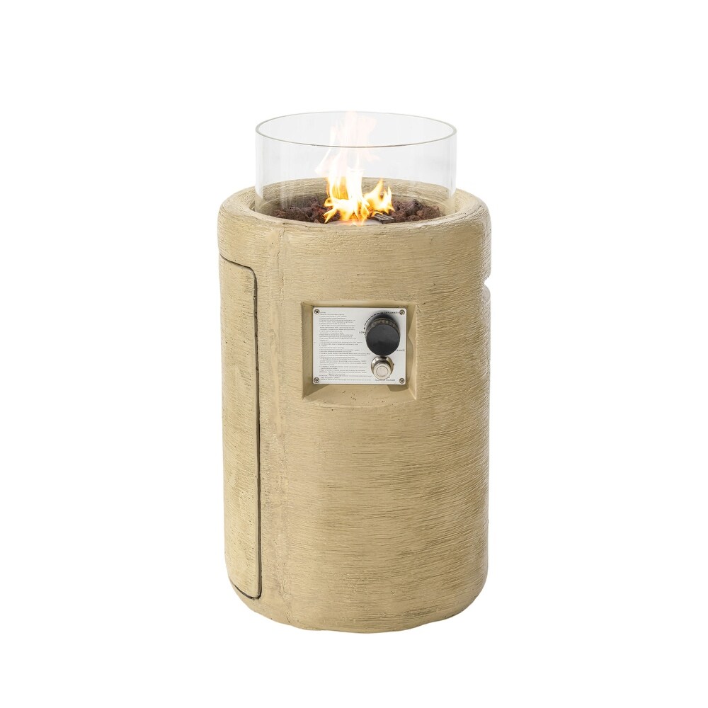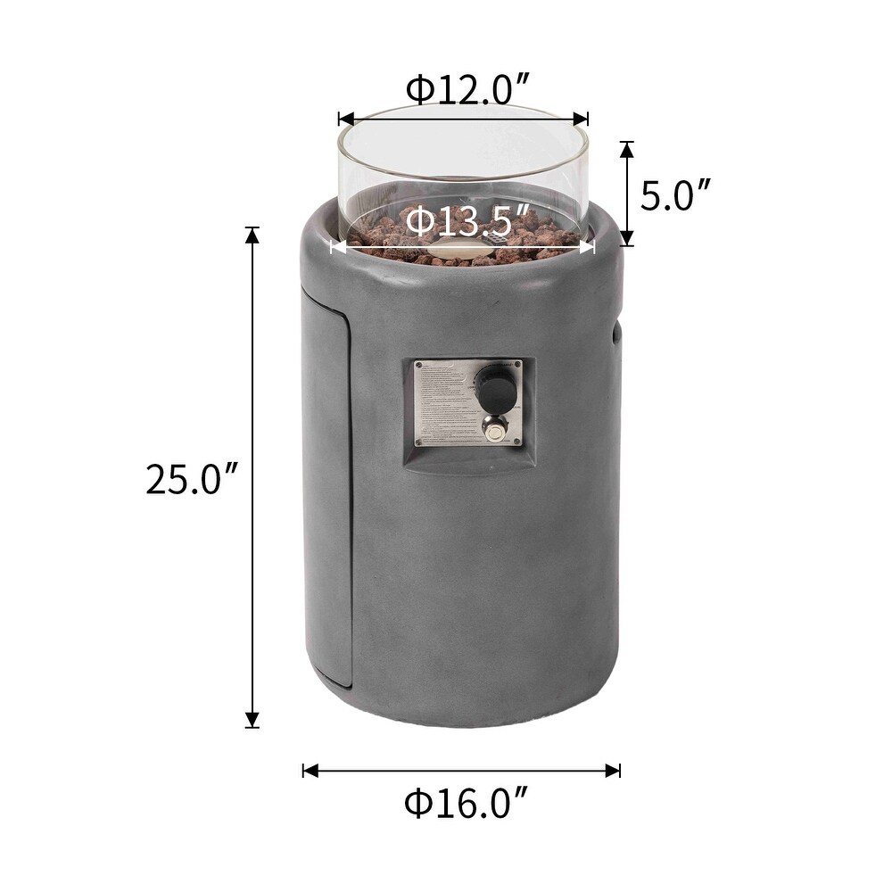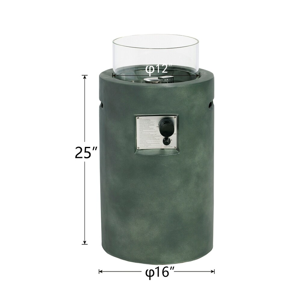 - Rustic stacked concrete-like pedestal base with glass wind guard