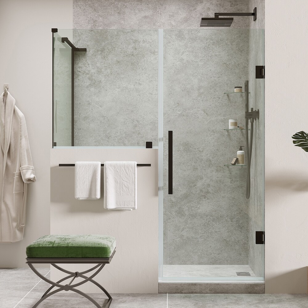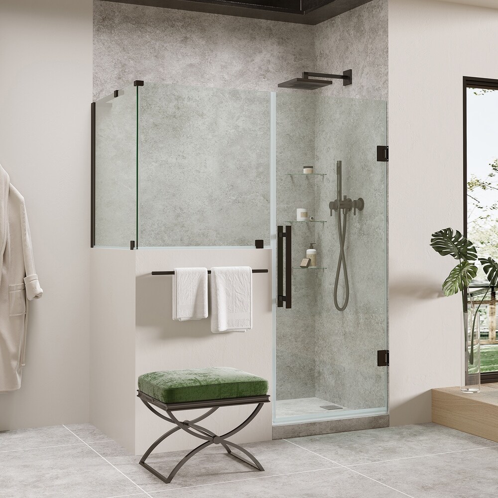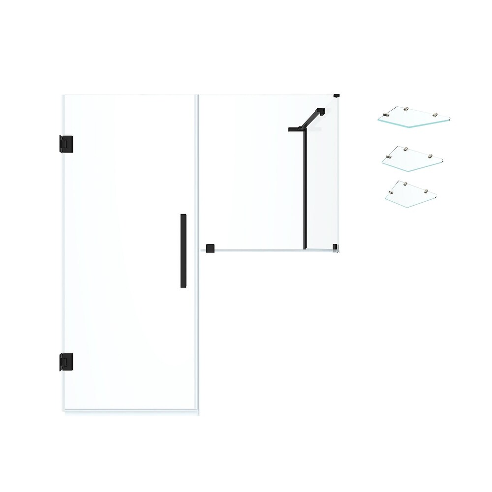 OVE Endless Tampa-Pro TP0194401, 47 7/8 in. W x 72 in. H Buttress Corner Frameless Hinge Shower Door in Black with Shelves. The OVE Decors Endless 47 7/8 in. Tampa-Pro frameless hinge shower door kit with buttress panel has a modern, minimalist design that pairs high functionality with contemporary style. The set comes with premium quality hardware, complete with a sleek Black finish, and includes a 23 in. wide door panel, a 24 in. wide buttress inline panel, a 30 in. wide buttress side panel, ideal for a Buttress Corner installation. All panels are made from Premium 8mm (5/16") thick certified tempered glass. Three corner shelves included. The convenient corner shelves make washing simple by keeping your products at arms length at all times.47 7/8 in. Width x 31 1/8 in. Depth x 72 in. Height with Buttress Panels, Model: TP0194401 Three corner shelves included. Frameless reversible door installation with built-in door magnet for a secure and tight close. No more leaks, no more wet floors. Premium 8mm (5/16") thick safety tempered glass. Certified by the Safety Glazing Certification Council (SGCC) MetalGuard? technology - premium protective metal coating to keep your hardware shiny for years to come. Oversized handle in Black finish included 5-Year Warranty on glass panels, and 1 year Warranty on hardware. Use the OVE Shower Configurator tool to customize and build your dream shower for your unique space Please review the Instruction Manual PDF for detailed product dimensions to ensure that the shower kit is right for your bathroom's measurements
